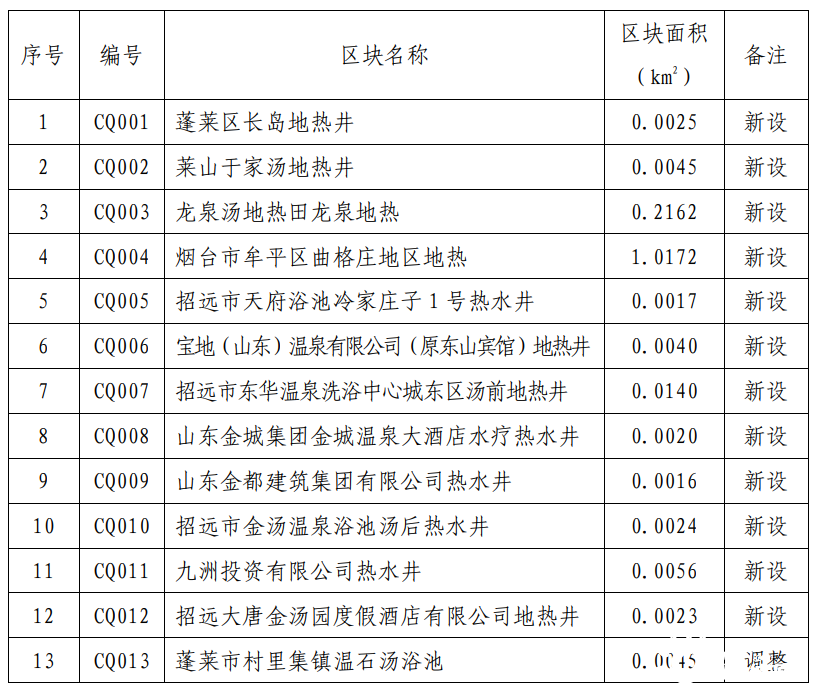 規(guī)劃期內(nèi),共設置地熱勘查區(qū)塊2處,分別為山東省棲霞市惠禾·艾山地區(qū)地熱普查和山東省棲霞市長春湖·霞光地區(qū)地熱普查,投放時間為2022年。規(guī)劃地熱重點開采區(qū)1處,位于招遠市東湯地熱田。重點開采區(qū)內(nèi)要嚴格按照開采規(guī)劃區(qū)塊優(yōu)先投放采礦權,鼓勵支持礦山企業(yè)整合重組,優(yōu)化開發(fā)布局,提高資源利用效率。