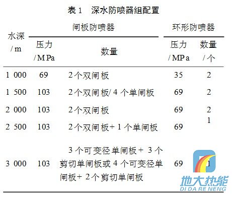 水下防噴器是海洋石油鉆采過程中用于防止井噴發(fā)生的專用設備,上部連接隔水管裝置,下部連接海底井口裝置。深水防噴器組通常有5個閘板和2個萬能防噴器組成,第5個閘板即底閘板可以剪斷套管,套管剪切閘板位于盲板的下部,以便在剪斷套管后可以關井,通常在套管可能遇卡或者鉆井裝置需要應急脫離時會用到。2個萬能防噴器是冗余設計的需要,上部萬能防噴器作為井控的主要手段。根據(jù)水深的不同,深水防噴器組通常有不同的配置。表1是在總結Transocean公司所有不同水深典型鉆井船防噴器組配置情況得出的,可以作為深水鉆井防噴器組配置的參考。 對于浮式鉆井裝置(半潛式平臺或鉆井船),選用防噴器系統(tǒng)的通徑為?476.3mm(工作水深<600m)或?425.5mm(工作水深>600m),選用封井壓力為69、103、138MPa時,視工作水深、海底至目的層深度和是否為特殊高壓的油氣層而定。為了適應欠平衡鉆井的需要,井口防噴器組合要配置高壓旋轉防噴器,即隨鉆壓力控制系統(tǒng)PCWD(Pres2sureControlWhileDrilling)。