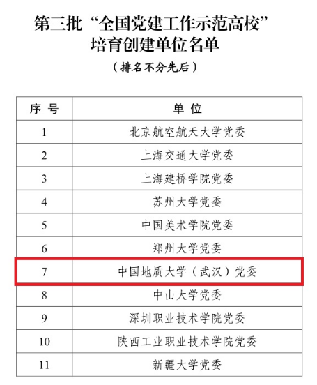近日,教育部下發(fā)了《教育部辦公廳關(guān)于公布第三批全國黨建工作示范高校、標桿院系、樣板支部培育創(chuàng)建單位名單的通知》,公布了第三批新時代高校黨建示范創(chuàng)建和質(zhì)量創(chuàng)優(yōu)工作評審結(jié)果,遴選產(chǎn)生了11個全國黨建工作示范高校、100個全國黨建工作標桿院系、1000個全國黨建工作樣板支部。中國地質(zhì)大學(武漢)黨委入選“全國黨建工作示范高校”培育創(chuàng)建單位,環(huán)境學院“張國旗班”黨支部、工程學院勘察與基礎(chǔ)工程系黨支部入選“全國黨建工作樣板支部”培育創(chuàng)建單位。
