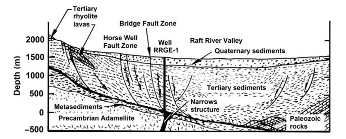 拉夫特河地?zé)崽?/a>的熱儲(chǔ)層,處在一個(gè)盆地中,這個(gè)盆地西部以一個(gè)小角度的斷層為界限,東邊則是由黑松山(Black Pine Mountains)和一個(gè)二次斷層分界。熱儲(chǔ)的蓋層為第三系的沉積層,基底巖石大約厚度為1600m,在這個(gè)深度被一個(gè)東北向的線性構(gòu)造—解理構(gòu)造(Narrows Structure)所貫穿,人們認(rèn)為這個(gè)結(jié)構(gòu)是基底剪切作用產(chǎn)生的。熱源為前寒武紀(jì)二長(zhǎng)花崗巖。開(kāi)始,人們認(rèn)為熱液是通解理構(gòu)造涌上來(lái),然后通過(guò)其他的褶皺和斷層蔓延整個(gè)沉積構(gòu)造。現(xiàn)在的人們則認(rèn)為有兩個(gè)熱源補(bǔ)給區(qū),一個(gè)來(lái)自西北方向沿著馬井?dāng)鄬臃植嫉难a(bǔ)給區(qū),另外一個(gè)則是來(lái)自東南方向的,可能是與變窄構(gòu)造有關(guān)聯(lián)。