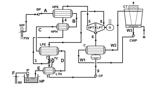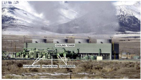 最新的USGeo拉夫特河發(fā)電站坐落在起初的電站南南東方向約600m的地方。這個(gè)最新的發(fā)電機(jī)組的能量對(duì)流系統(tǒng)是一個(gè)部分回?zé)幔?jí),雙壓力雙循環(huán)發(fā)電機(jī)組。有兩個(gè)單獨(dú)的單元,每一個(gè)單元都有兩個(gè)軸向流動(dòng)的渦輪來(lái)驅(qū)動(dòng)同一個(gè)中心發(fā)電機(jī)。一個(gè)四室的水冷卻塔為殼管冷凝器(shell-and-tube condensers)提供冷卻提供冷卻水。補(bǔ)充水是從水井中獲取的,而且需要及時(shí)處理來(lái)維持冷卻塔中的水的質(zhì)量。138℃的鹵水以大約3.15×106kg/s的速度泵向蒸發(fā)器和預(yù)熱器,循環(huán)工質(zhì)異戊烷(i-C5H12)就是在蒸發(fā)器和預(yù)熱器中吸收溫度的。換熱器只在高壓循環(huán)中才使用。
