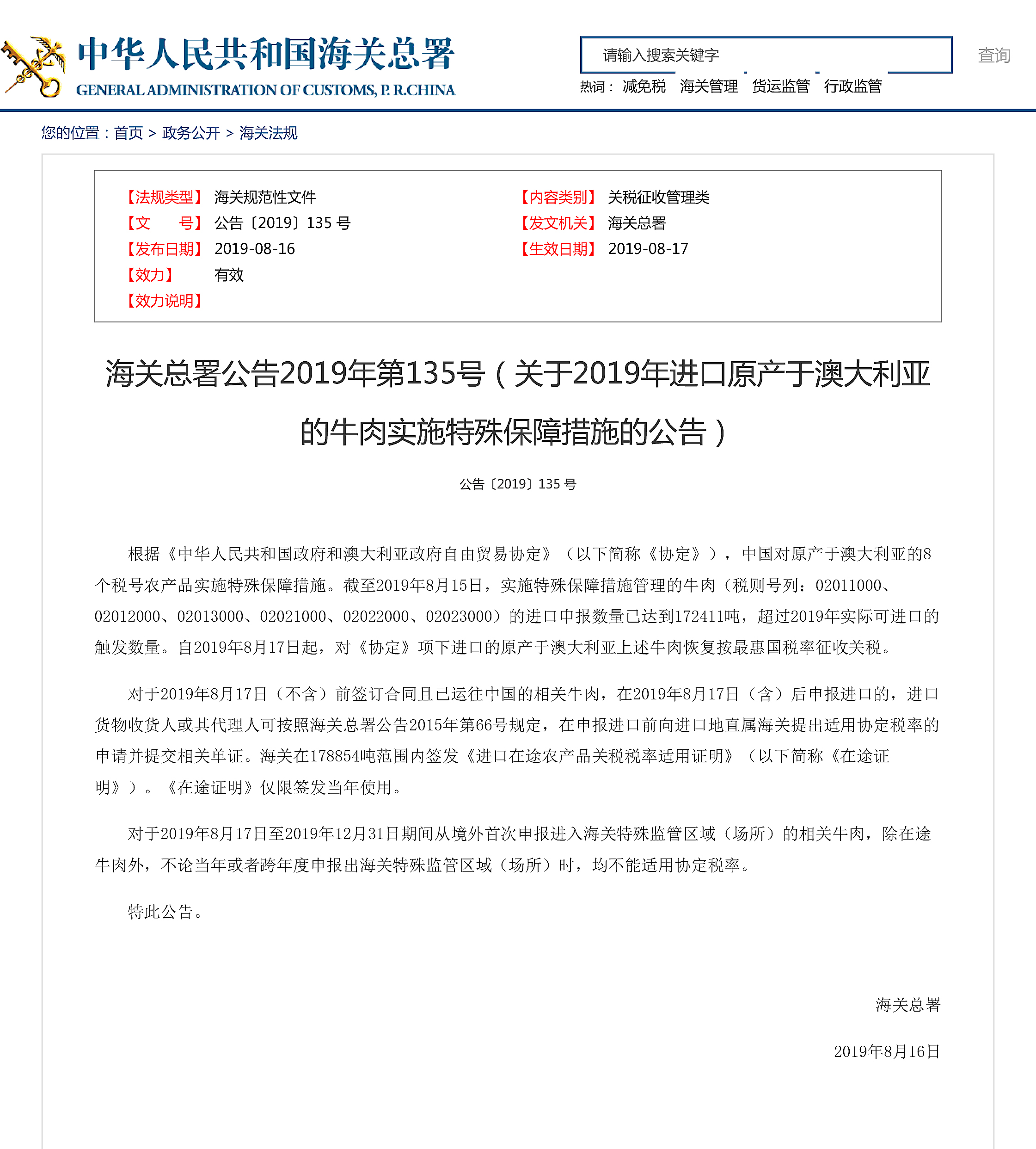 下圖是我們從中國海關(guān)總署的官網(wǎng)查閱到的海關(guān)總署2019年第135號公告的截圖,該公告是8月16日下發(fā)的,主要內(nèi)容是關(guān)于此次2019年進(jìn)口原產(chǎn)于澳大利亞的牛肉實(shí)施特殊保障措施。