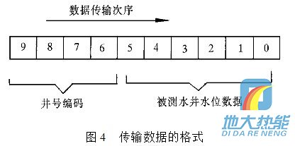 現(xiàn)在通過單片機(jī)輸出控制一組由三極管組成的電子開關(guān),由電子開關(guān)代替按鍵功能完成數(shù)據(jù)輸入.例如:要傳輸十進(jìn)制數(shù)據(jù)0,1,2,3,4,5,6,7,8,9,單片機(jī)依次輸出接通雙音頻編碼器輸入數(shù)字按鍵0,1,2,3,4,5,6,7,8,9對圖4 傳輸數(shù)據(jù)的格式應(yīng)的電子開關(guān)的控制信號,則該組數(shù)據(jù)經(jīng)雙音多頻編碼器轉(zhuǎn)換為雙音頻信號. 雙音多頻編碼器在單片機(jī)控制下,定時(shí)“撥通”水位監(jiān)測中心電話號碼,在水位監(jiān)測中心計(jì)算機(jī)應(yīng)答并“摘機(jī)”的情況下,通過這條已接通的電話線路,將所測的水位數(shù)據(jù),經(jīng) 過雙音多頻編碼器編碼后傳送到監(jiān)控中心. 要傳輸?shù)臄?shù)據(jù)格式為:數(shù)據(jù)長度為10位十進(jìn)制數(shù),其中高四位為井號編碼,低六位為所測量的水井水位數(shù)據(jù),水位數(shù)據(jù)分整數(shù)和小數(shù)兩部分.數(shù)據(jù)傳輸?shù)姆较蚴菑母呶坏降孜?數(shù)據(jù)格式如圖4所示.