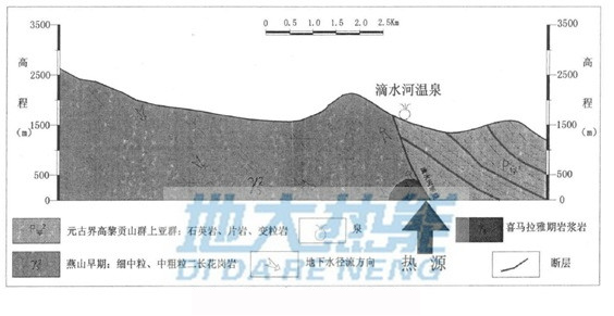 云南滴水河溫泉風(fēng)景出露區(qū)地形地貌特征主要受滴水河河流侵蝕的影響,為河流侵蝕地貌類(lèi)型,其出露位置主要受滴水河斷層控制。