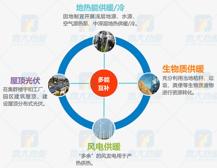 地熱+(風能、太陽能、氫能、儲能、水能、生物質(zhì)能等)新能源,根據(jù)因地制宜、多能互補實現(xiàn)能源綜合開發(fā)利用。